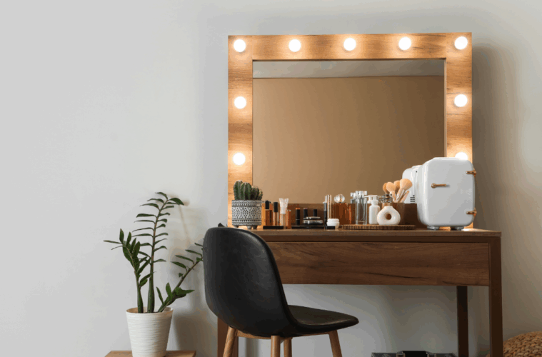 Por fim, limpe a penteadeira camarim a cada dois ou três dias com pano seco ou levemente úmido. Essa manutenção remove pó e resíduos de maquiagem da superfície. Na verdade, a limpeza regular preserva o acabamento do móvel e mantém o ambiente sempre agradável.