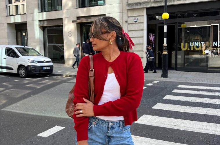 Look neutro, e um toque de vermelho nos pés. Esta é uma fórmula fácil de repetir e que oferece sofisticação sem grandes esforços – e ainda, por cima, traz uma referência natalina sutil.