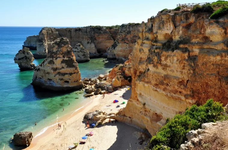 Uma das praias mais bonitas do Algarve, a Praia da Marinha, nos arredores de Carvoeiro, é famosa pelo seu cenário espetacular e águas do mar turquesa. Além da água calma, um dos destaques são os arcos naturais, que formam um espetáculo fotogênico. O acesso é feito por escadas e vale muito a visita.
