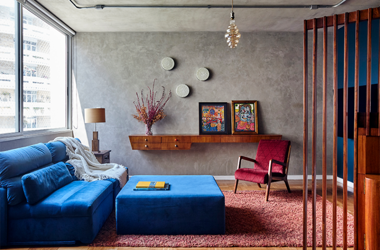 Na reforma deste projeto, a arquiteta realizou o retrofit de um apartamento dos anos 60, localizado no bairro de Higienópolis, em São Paulo. A paleta de cores intensas soma personalidade ao projeto, com uma seleção de tons que se destacam diante da parede e do teto em cimento queimado. O vermelho do tapete e da cadeira da sala de estar acrescenta um toque elegante e autêntico ao ambiente.