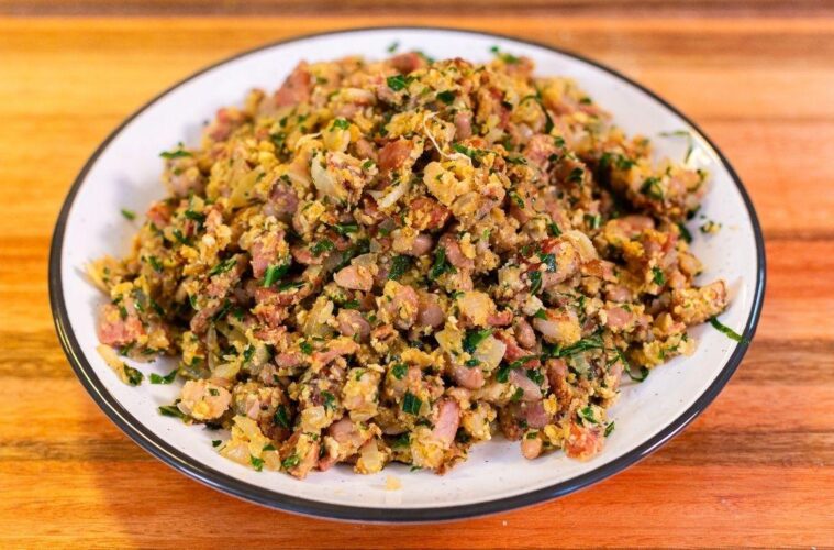 Por isso, vá adicionando com calma. O melhor feijão tropeiro é aquele que fica soltinho, mas ainda macio na boca.